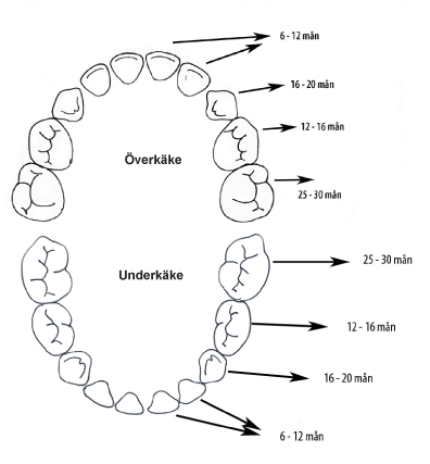 Det brukar vara de två mittersta framtänderna i underkäken som kommer först. Sen kommer motsvarande tänder i överkäken. När barnet är mellan ett och två år kommer de första kind- och hörntänderna. Ett barn ska ha fått 20 tänder totalt fram till tre-årsåldern.