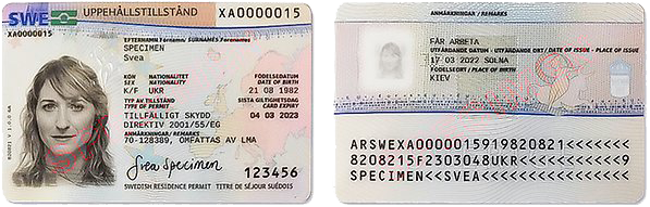 Läs under fråga "Hur identifierar sig en person som har beviljats uppehållstillstånd enligt massflyktsdirektivet?"