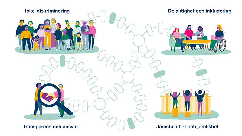 En central del av mänskliga rättigheter är diskrimineringsförbudet. Det betyder att alla människor ska ha samma rättigheter och inte bli behandlade sämre på grund av kön, könsidentitet eller könsuttryck, ålder, religion, etnicitet, sexuell läggning eller funktionsförmåga. Vi måste alltid säkerställa att vår verksamhet inte förstärker diskriminering.