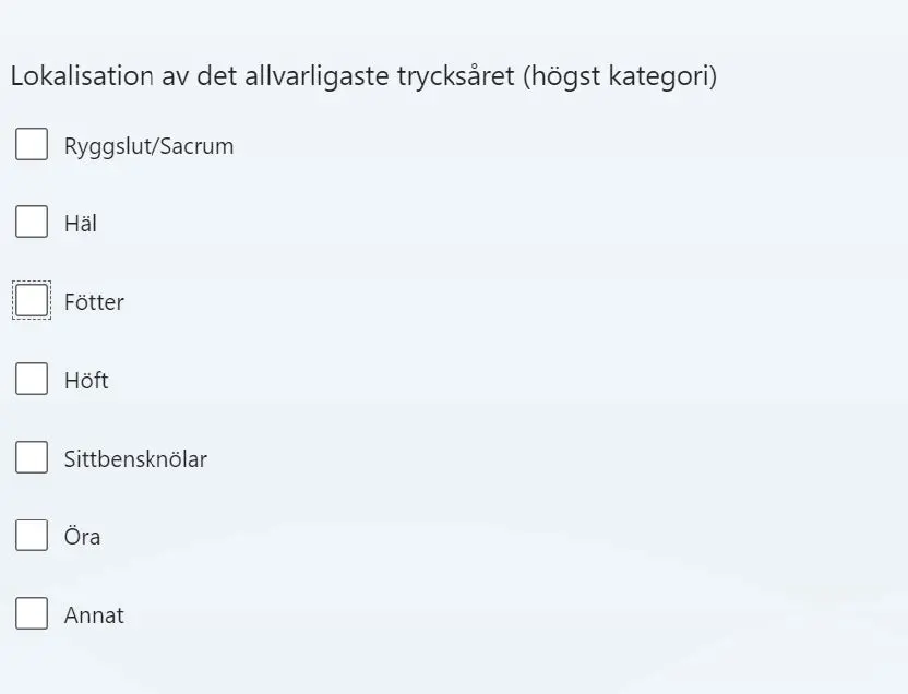 - Om patienten har trycksår, registrera vilken kategori såret tillhör (om patienten har fler än ett sår, välj flera alternativ).