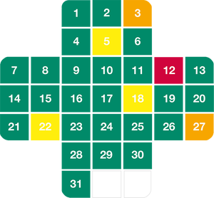 Varje ruta i Gröna Korset symboliserar en veckodag. Aktuellt datum färgmarkeras utifrån identifierad risk eller vårdskada.