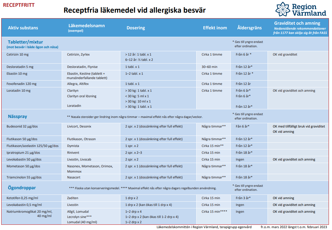Lathunden "Receptfria läkemedel vid allergiska besvär" ger en översikt över vilka läkemedel som finns tillgängliga receptfritt på öppenvårdsapotek. Lathunden innehåller uppgifter om bland annat beredningsform per substans, åldersgränser samt dosering och är tänkt att fungera som ett hjälpmedel för vårdpersonal vid rådgivning och rekommendation.