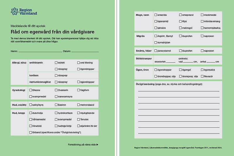 Blanketten kommer att tryckas och skickas ut på A5-block till samtliga vårdcentraler i slutet av maj. Övriga vårdenheter kan beställa blanketten på webben via formuläret nedan. Det går att skriva ut blanketten på terapigrupp receptfri egenvårds webbsida redan nu.