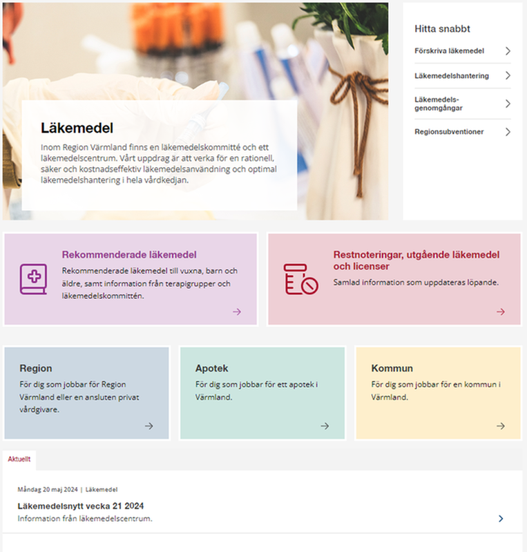 På vårdgivarwebben hittar du framöver bland annat nyhetsbrevet Läkemedelsnytt, information om restnoteringar, utgående läkemedel och licenser, förskrivning, läkemedelsgenomgångar och ordinationsmallar i Cosmic. Kvar på intranätet blir information som vi av säkerhetsskäl inte bör dela med allmänheten, det vill säga läkemedelsberedning och läkemedelsförsörjning.