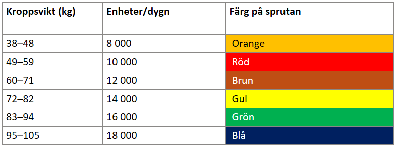 Kroppsvikt (kg) | Enheter/dygn | Färg på sprutan |