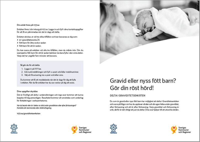 Två av tre delenkäter går ut efter förlossning. Därför är barnhälsovården en mycket viktig informationskanal. Vid besöket åtta veckor efter förlossning samt eventuellt vid ettårskontrollen, ta upp Graviditetsenkäten, ge information samt fråga om personen har en inloggning och kontaktuppgifter på 1177.se.