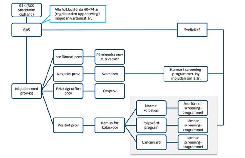 Bilden ovan visar vad som händer efter att personer fått inbjudan med prov-kit. GSK = Gemensamt samordningskansli som finns hos Regionalt cancercentrum Stockholm – Gotland. GAS = Gemensamt administrativt IT-stöd, det är den enhet som skickar ut inbjudan till provtagning.SveReKKS = Svenskt kvalitetsregister för koloskopi och kolorektalcancerscreening.