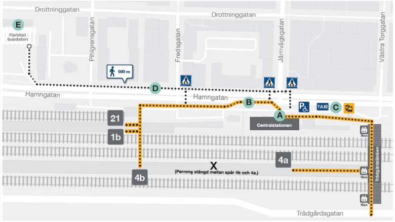 Så tar du dig till spåren på Karlstad CentralstationSka du resa med tåg eller ersättningsbuss från Karlstad Centralstation? Här hittar du karta och mer information.