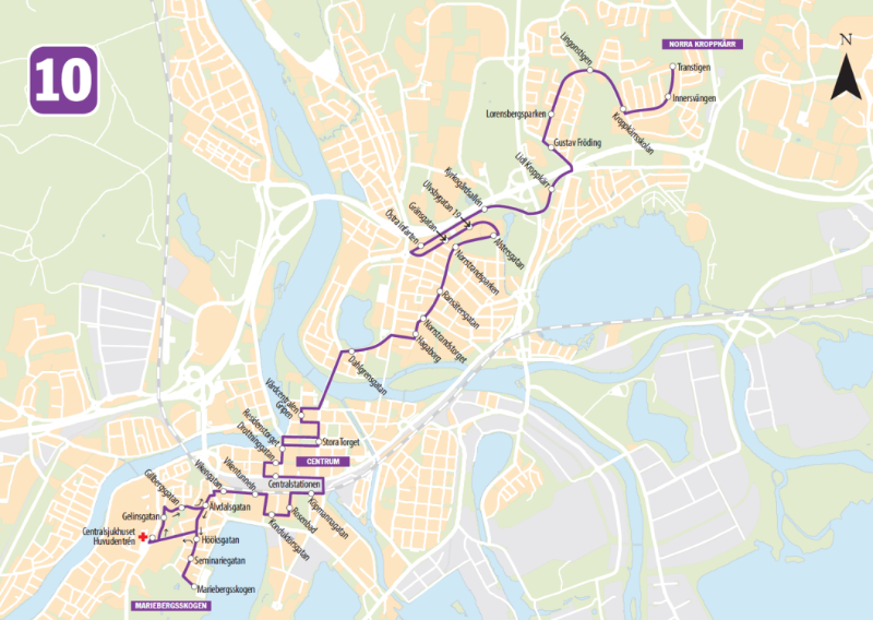 Linje 10 går mellan Norrstrand och Mariebergsskogen via Stora Torget och Viken.