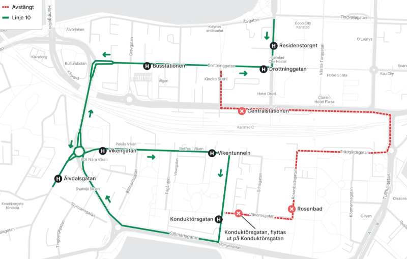 Följande hållplatser är tillfälligt stängda för vissa linjer som går en annan väg på grund av vägarbete kring Karlstads resecentrum: