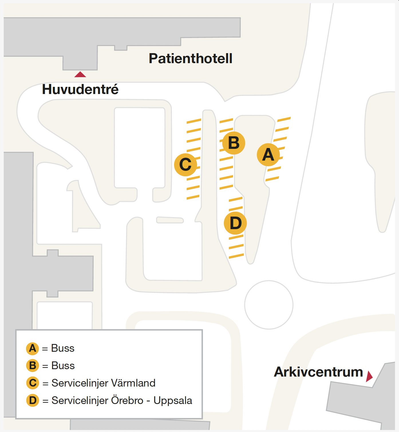 Kartan ovan visar var du hittar hållplatser för servicelinjer och ordinarie busstrafik vid Centralsjukhuset i Karlstads huvudentré. Klicka här för en större bild (png). png, 683 kB.