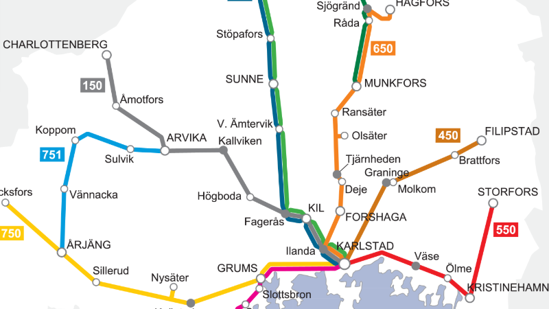 Här ser du delar av Värmlandstrafiks nät av servicelinjer som trafikerar vårdcentraler och sjukhus runt om i Värmland.