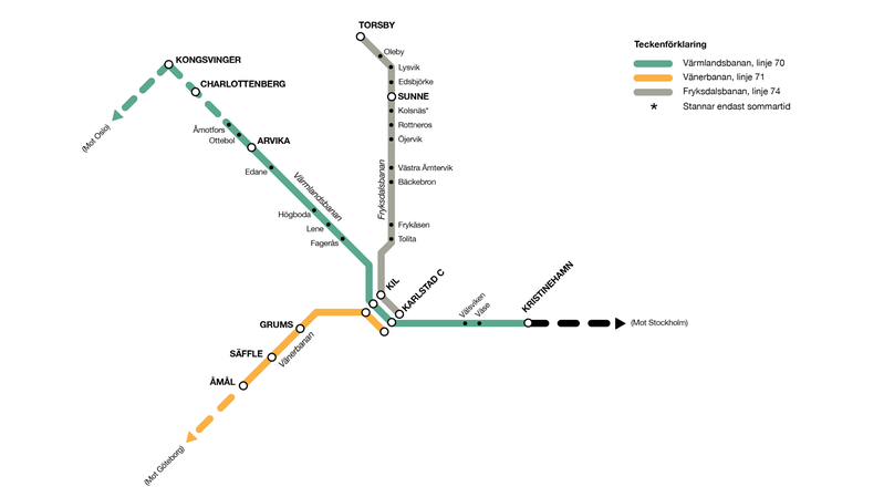 71 | Karlstad - Kil - Grums - Säffle - Åmål - Göteborg | Linje 71 trafikeras av SJ och du kan köpa resor via Värmlandstrafik på sträckan Åmål-Karlstad. Aktuella trafikstörningar på sträckan Åmål-Karlstad hittar du på sj.se . | |