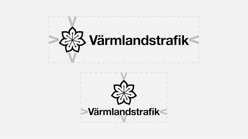 Minsta mått för logotypen. Om varianterna görs i mindre storlek blir läsbarheten inte tillräcklig. Logotypens proportioner (bredden i förhållande till höjden) är fast och ska aldrig förändras. Vid tryck i små format bör den svarta logotypen användas.